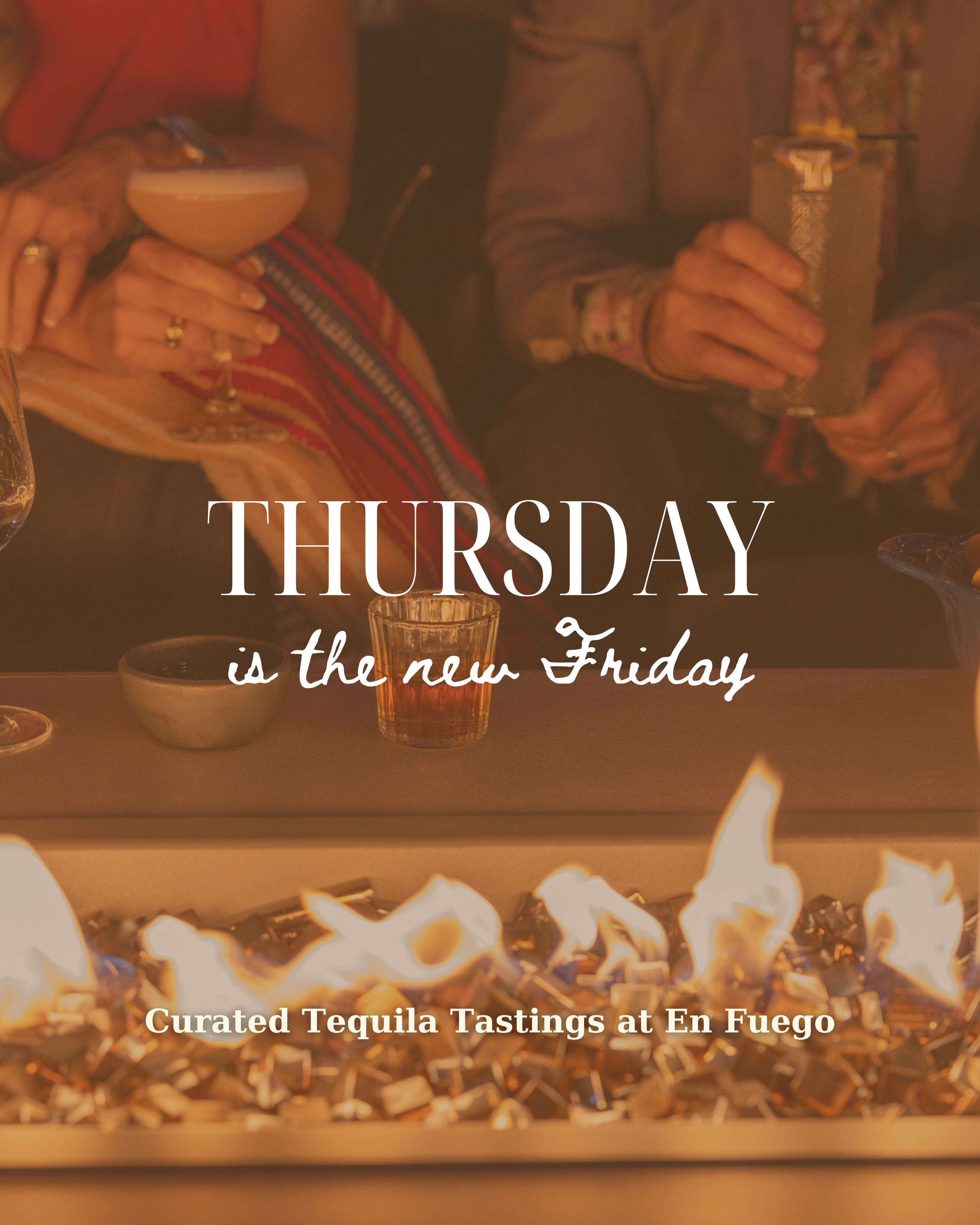 Join us for Tequila Thursdays, a guided tasting led by our resident Tequila Enthusiast, Emilia Cortes. Each event features a unique lineup of tequilas paired with light bites to match the bold flavors in your glass. No two tastings are the same—every month is a fresh adventure through En Fuego’s extensive and legendary tequila collection.